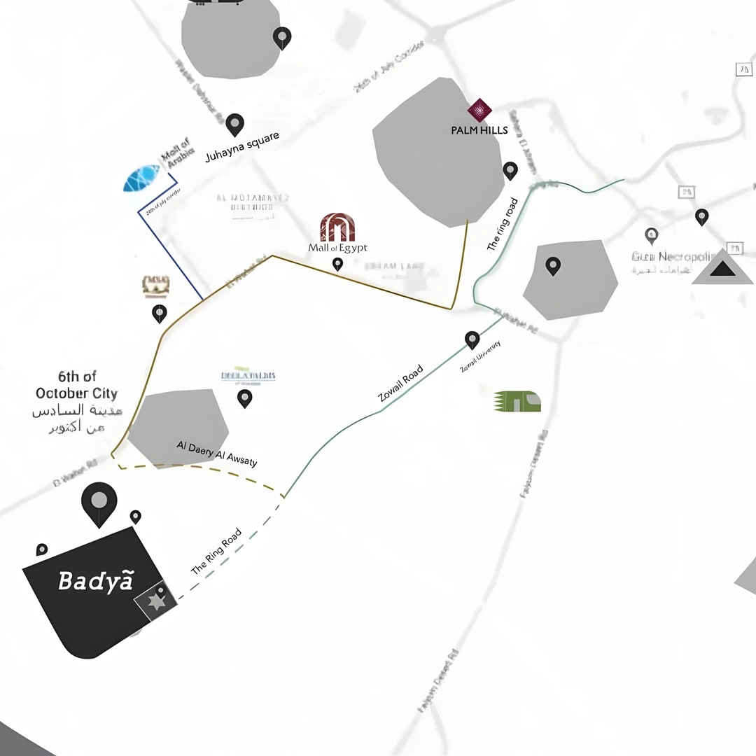 موقع كمبوند بادية بالم هيلز يسهل الوصول إليه من مختلف مناطق أكتوبر وزايد، مما يجعل بادية من أفضل خيارات السكن والاستثمار